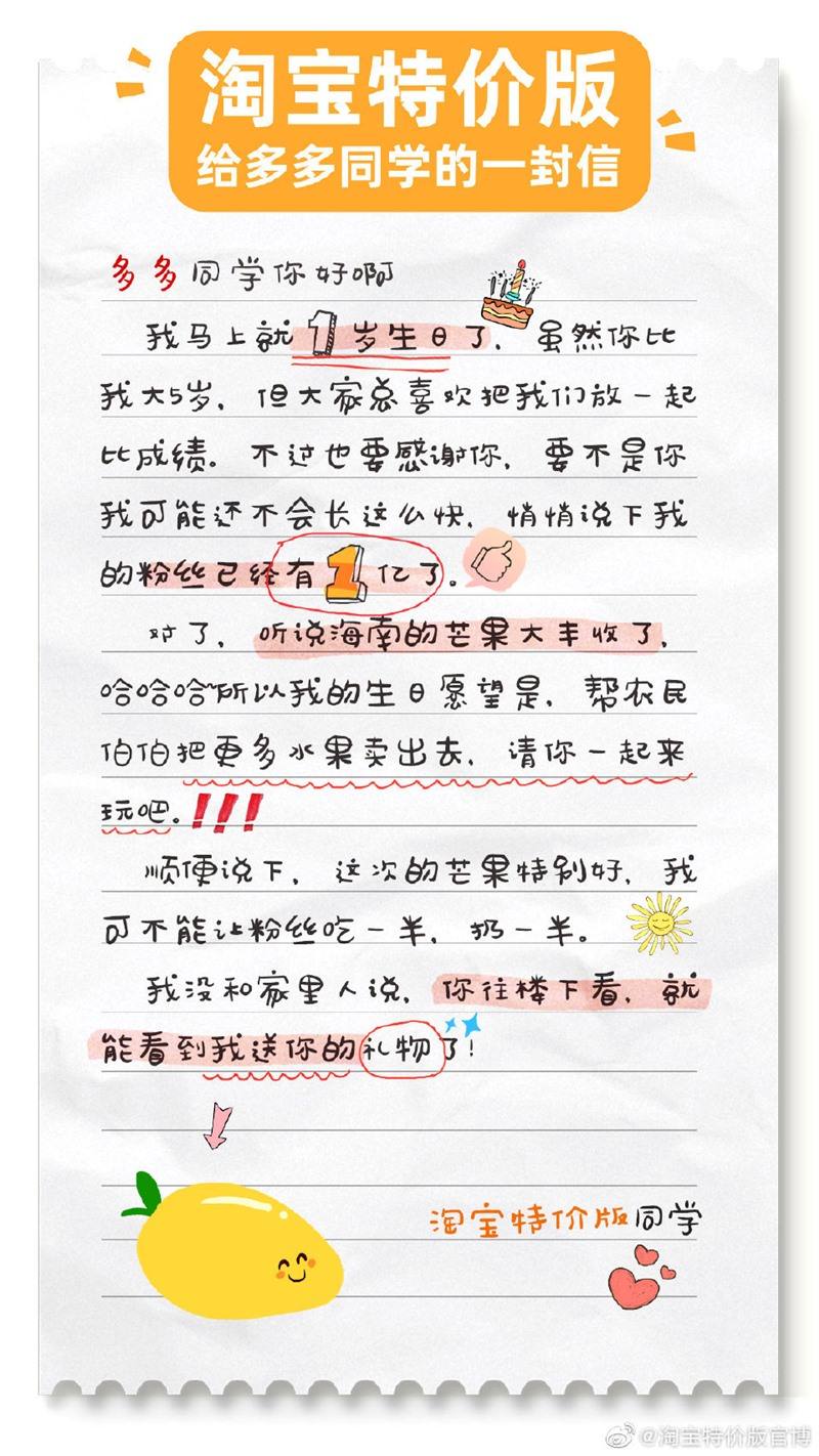 淘宝特价版表示,自己马上1岁了,粉丝已经马上有1亿了。听说海南的芒果大丰收了,我的生日愿望是,帮农民伯伯把更多水果卖出去,请你一起来玩吧。顺便说下,这次的芒果特别好,我可不能让粉丝吃一半,扔一半。我没和家里人说,你往楼下看,就能看到我送你的物了!