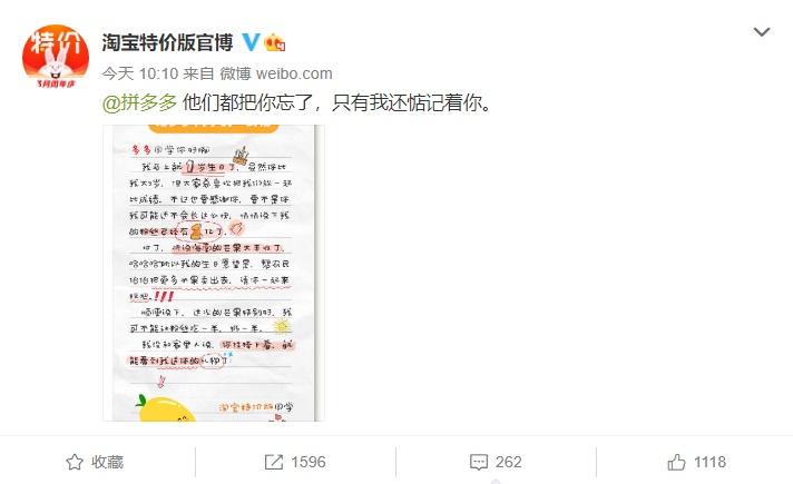 3月23日消息 今天上午淘宝特价版官方微博喊话拼多多,表示要给拼多多送芒果礼物。淘宝特价版表示:@拼多多,他们都把你忘了,只有我还惦记着你。