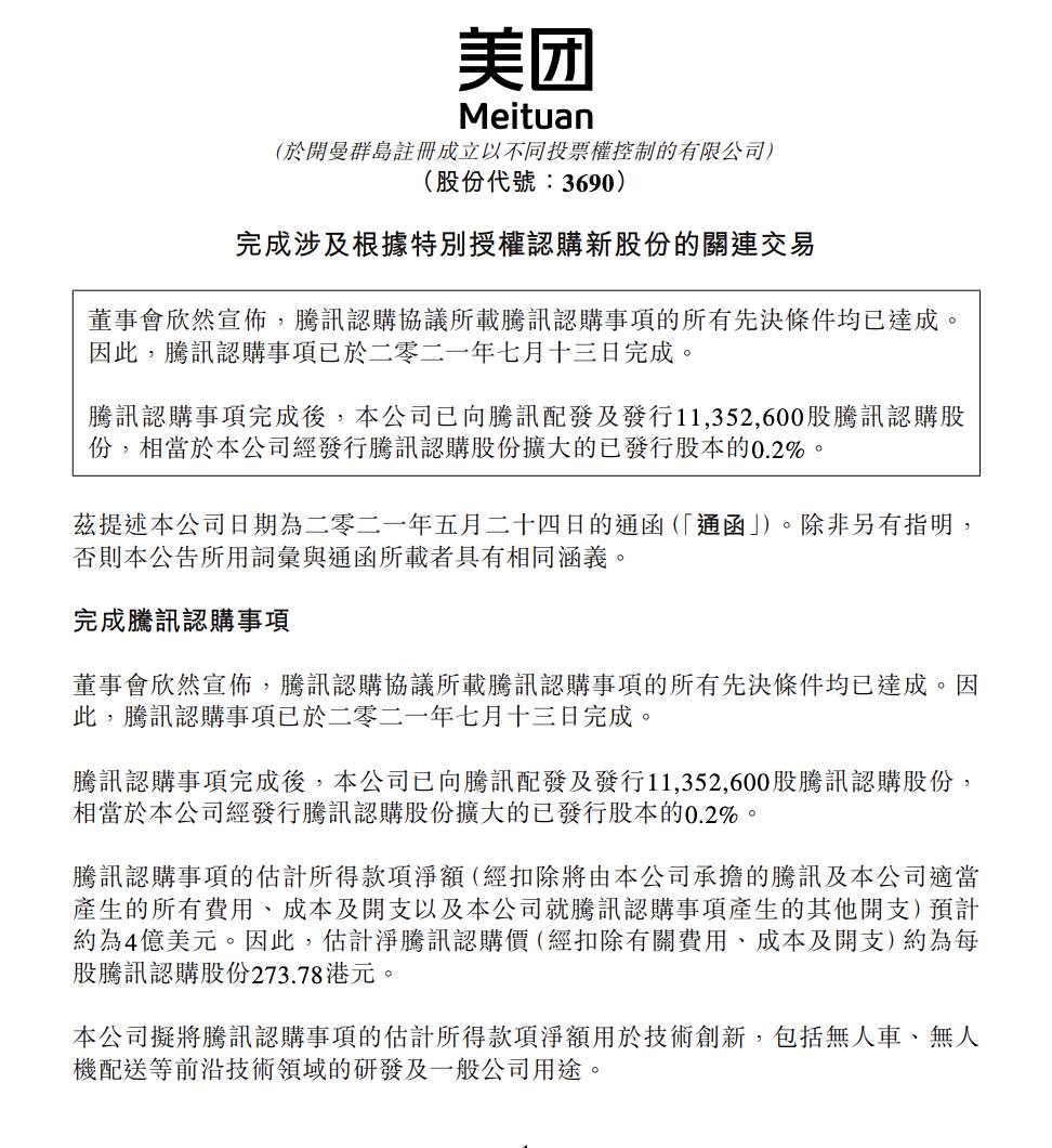 日前,美团发布公告确认腾讯认购协议所载腾讯认购事项的所有先决条件均已达成,认购事项已于7月13日完成 。公告显示,此次腾讯增资预计约为4亿美元(约合人民币26亿元)。