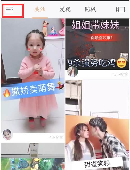 首先打开快手,进入主界面,点击左上角的三道杠按钮,进入菜单界面;