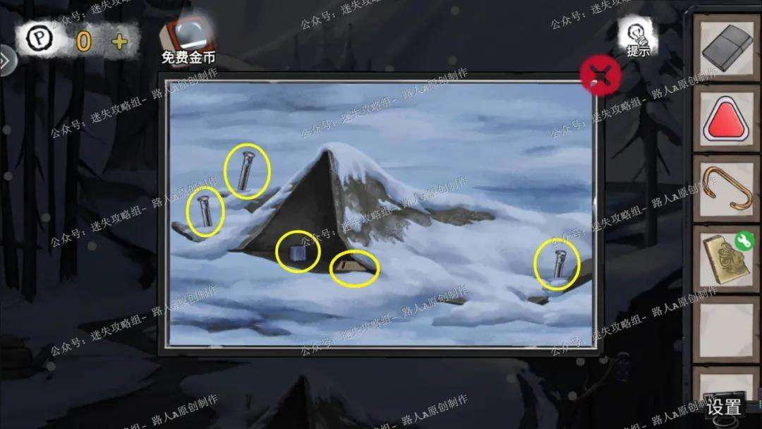 40. 进入树屋,点击楼梯上的木盒,放入【滑块】,完成谜题,获得【雪鞋】。用【剪刀】剪开袋子,获得【浮雕】。
