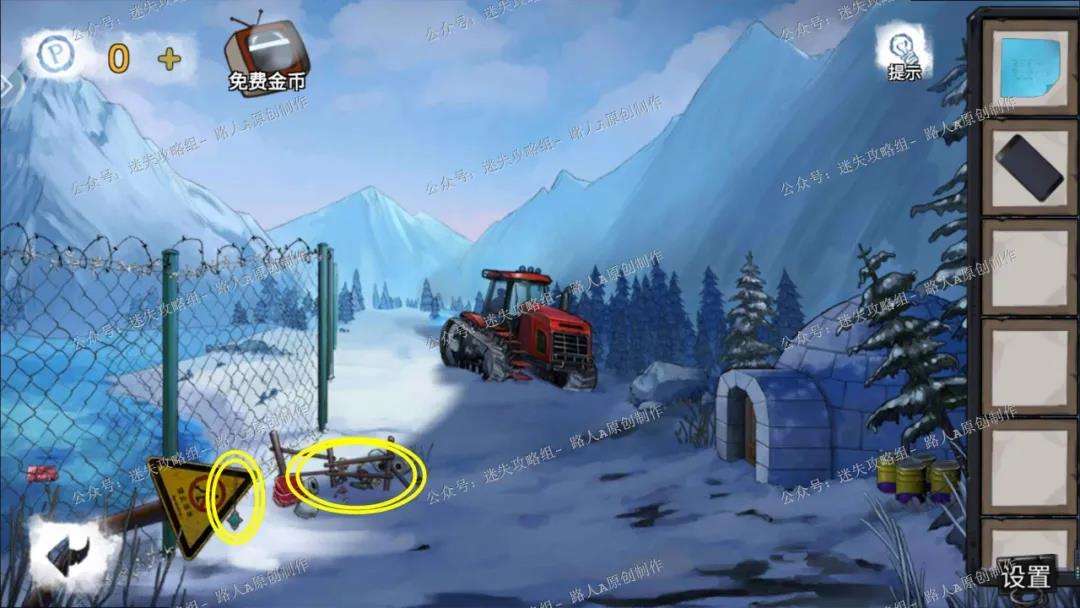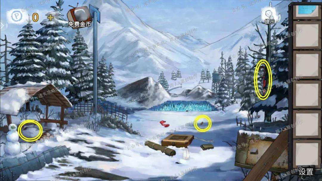1. 拾取雪人身上的【锅铲】,用【锅铲】清除地上的雪堆。拾取盒子上的【镜子碎片】,然后打开背包,拾取【煤油】。