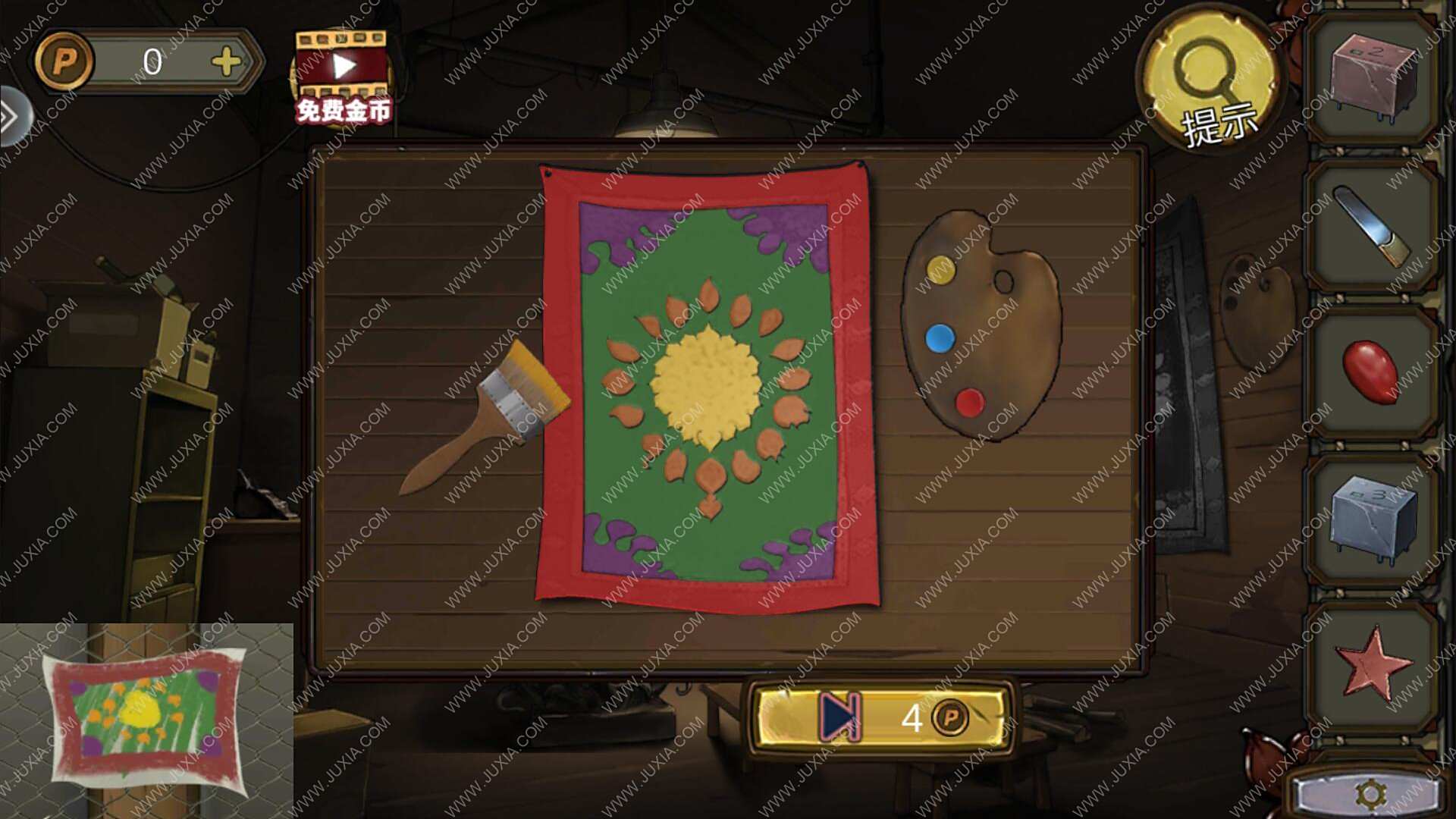 36.返回码头左侧的木屋,把3个【颜料块】放入墙上的调色盘,根据电影院门前的儿童简笔画提示,完成地毯的涂色(如图)。获得【把手】。36.1