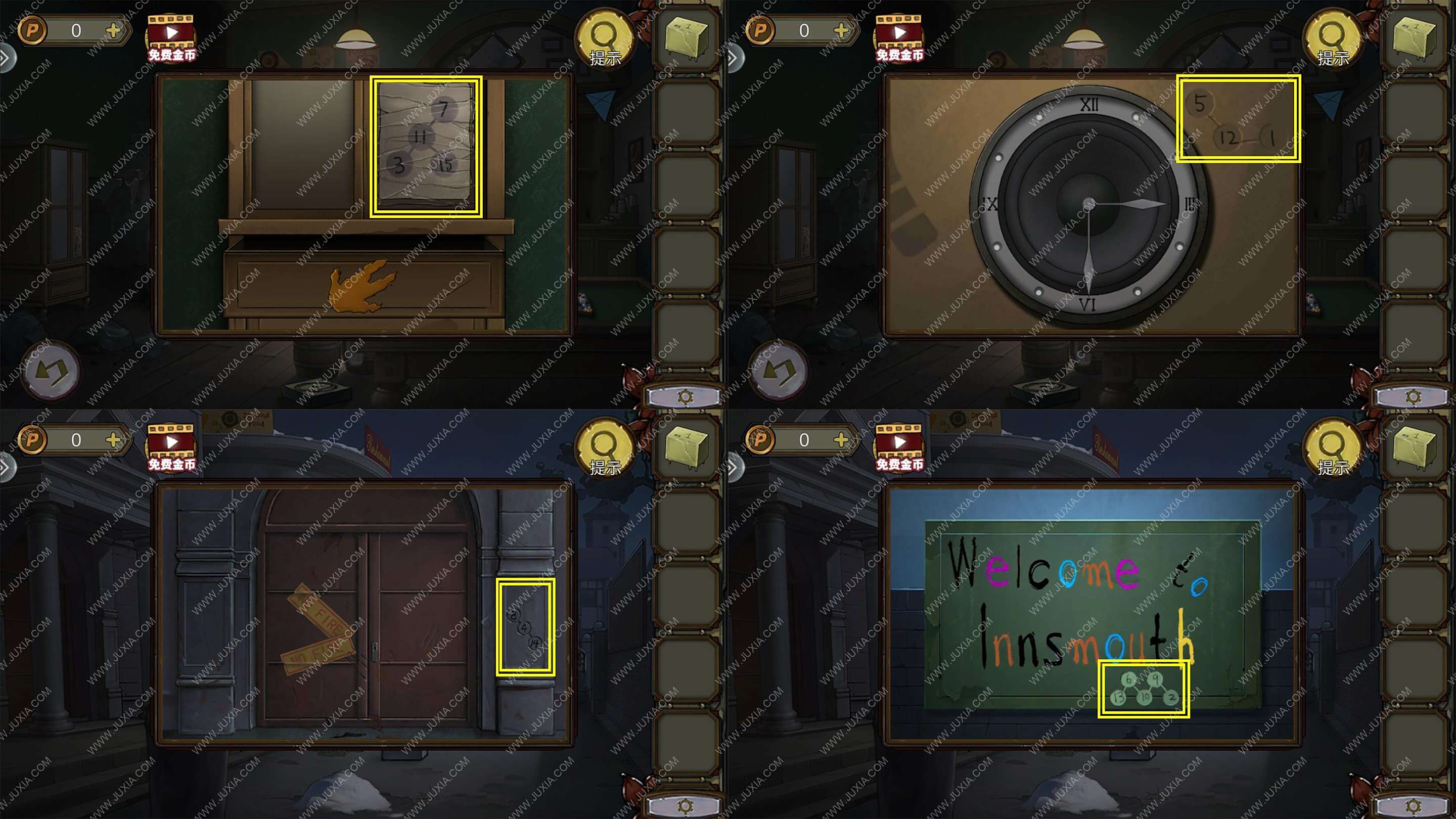 26.点击停在码头的小船,捡起保险箱上的【开琴器】。点击船帆,捡起掉落的【继电器】。然后根据4个地方的人物画像提示,调整保险箱上的眼睛方向(如图),获得【木塞】和【溶胶剂】。26.1、26.2