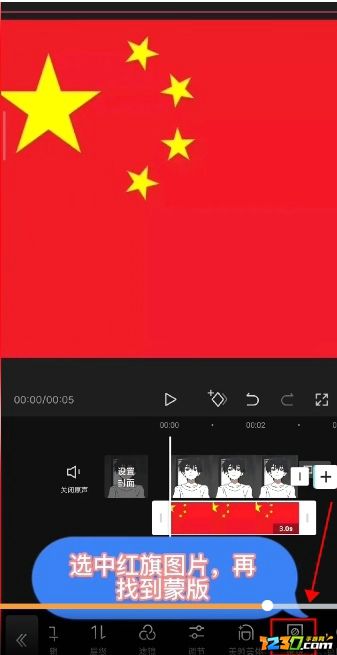 6.点击选中红旗图片,在下方的功能栏滑动,找到“蒙版”功能。