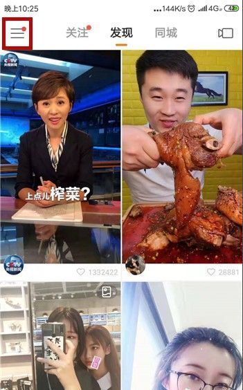 1.首先需要先解除账号功能,打开快手后点击左上角的【三】。