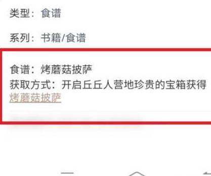玩家们要想获得披萨食谱就要去到地图上风龙废墟地区的丘丘人部落,在部落的营地上有个宝箱,我们先把丘丘人都击杀,就可以开启宝箱获得烤蘑菇披萨食谱了。制作烤蘑菇披萨需要的配方有蘑菇*4、面粉*3、卷心菜*2、奶酪*1。