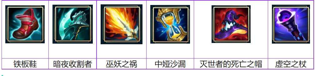 铁板鞋+暗夜收割者+巫妖之祸+中娅沙漏+灭世者的死亡之帽+虚空之杖