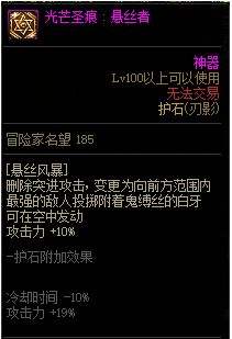 DNF刃影护石选择曜夜斩+心斩+悬丝风暴,符文紫蓝红9保1曜夜斩。
