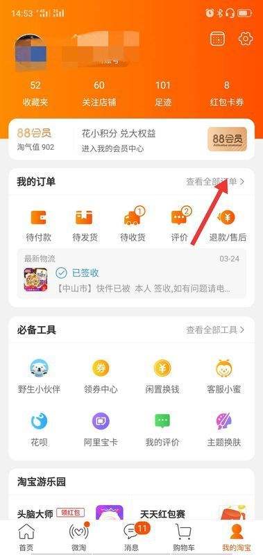 1.打开手机淘宝,在我的页面上找到,点击查看所有订单。