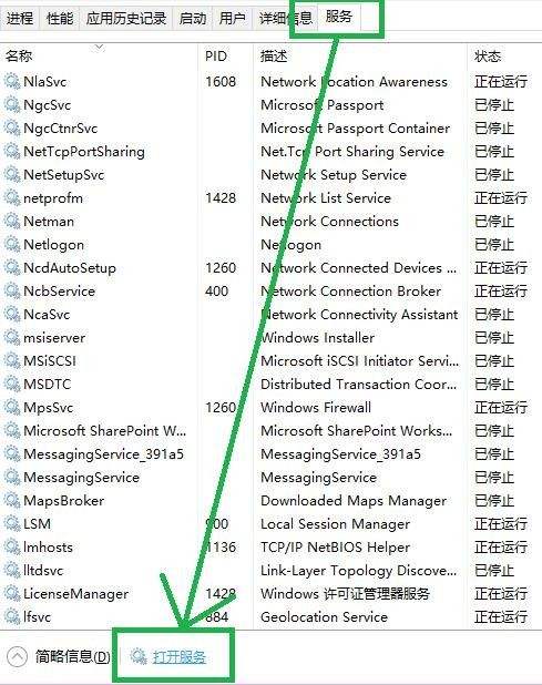 1.右键单击任务栏-打开任务管理器-选择服务-单击打开服务。
