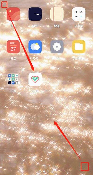 1.在OPPO手机桌面,从斜上角双指向内捏合,进入桌面编辑页面。