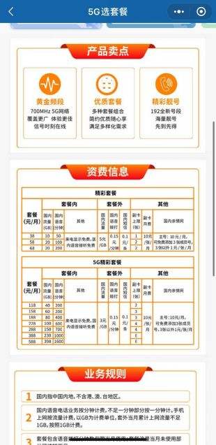 根据官网消息,5G精彩套餐分为118元至588元七档,其中118元套餐含40GB国内流量、200分钟国内通话;158元套餐含60GB国内流量、200分钟国内通话;188元套餐含80GB国内流量、400分钟国内通话;228元套餐含100GB国内流量、600分钟国内通话;288元套餐含150GB国内流量、700分钟国内通话;388元套餐含230GB国内流量、1000分钟国内通话;588元套餐含398GB国内流量、1600分钟国内通话。
