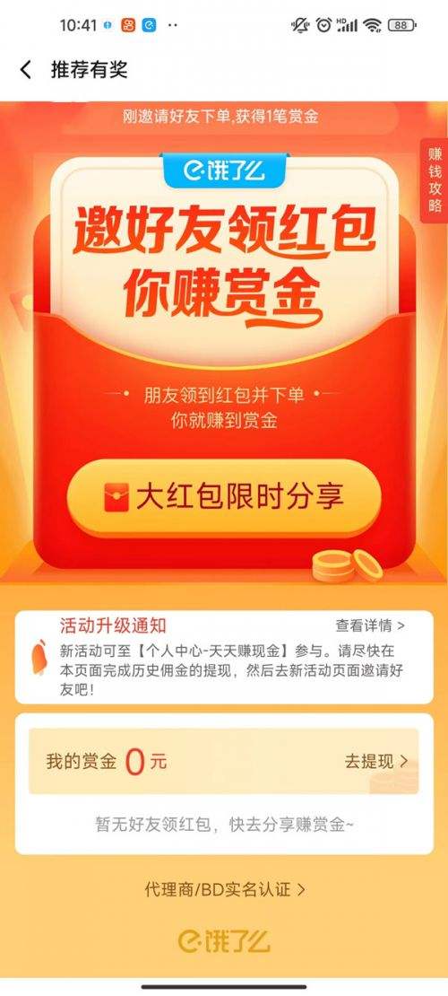 答:每成功邀请一名饿了么推荐有奖活动新用户,可能获得的赏金金额范围为0.01元-15.0元,赏金金额随机,具体以活动页面展示为准。受邀请的用户下单实付不足7元,则赏金为0.01元。