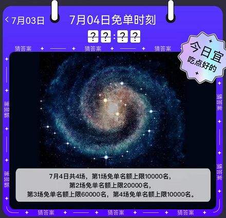 说明:7月4日共4场,第1场免单名额上限10000名,第2场免单名额上限20000名,第3场免单名额上限60000名,第4场免单名额上限10000名。