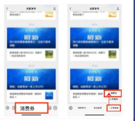 2.关注成功后,在微信官方账号聊天页面输入消费券,或点击小布服务中的消费券,然后根据提示点击相应的链接。