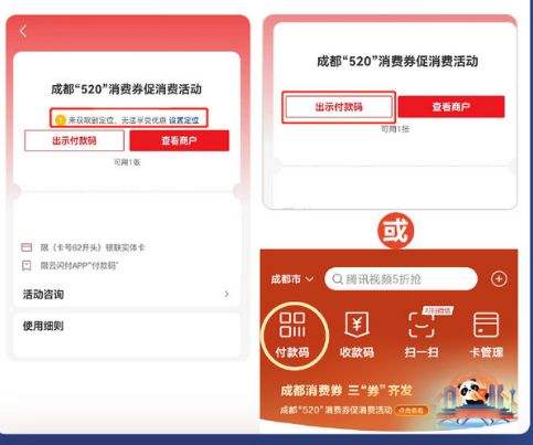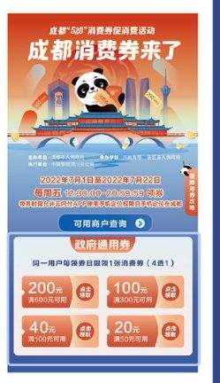 2022年7月1日-202年7月22日每周五12:30:00-20:59:.7月8日.7月15日和7月224日中午,用户可以开始抢券。在收到代金券时,允许云内付款APP使用手机定位权限,手机定位在成都。消费券金融资金1亿元与银行叠加.各大商户共发放2亿元优惠活动,涵盖零售业务.餐饮.文化旅游等行业。