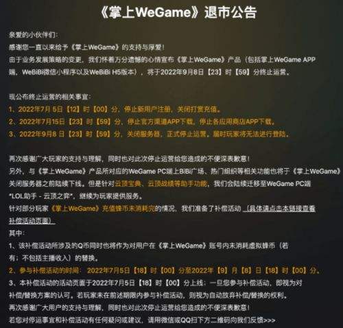 由于业务发展的变更,我们怀着万分遗憾的心情宣布《掌上WeGame》产品(包括掌上WeGame APP端,WeBiBi小程序),将于2022年9月8日【23】时【59】分终止运营。