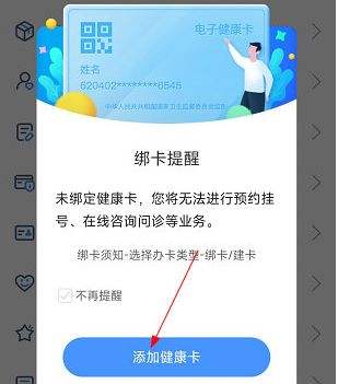 1、首次进入厦大一附院APP,提示用户绑定健康卡,点击添加。