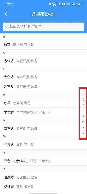 4、选择【到达地】,可以显示对应到达的地点和汽车站;