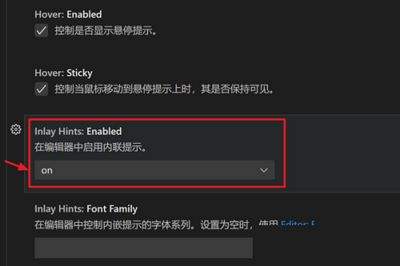 4.最后在设置界面中设置“InlayHints:Enabled”项的值为“on”这样才能成功VScode编辑器中使用内联提示。