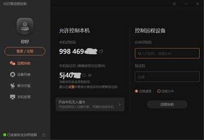 第三步:注册账号,注册后登录2个向日葵软件。您将看到带有设备识别码和设备验证码的弹出窗口。及其合作伙伴识别码和验证码。如果需要控制哪台计算机,请输入相应的序列号和验证码“远程操作设备”单击下面的相应栏,然后单击“远程协助”能够,然后在被控制的电脑弹出是否允许弹出框,点击同意,即可进行远程控制。