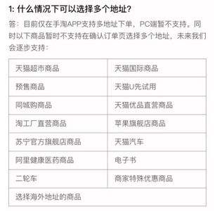 目前只支持淘宝手机App多地址下单,PC目前不支持。天猫超市.天猫国际.阿里健康.预售商品等暂时不支持在确认订单页面选择多个地址,未来将逐步开放。