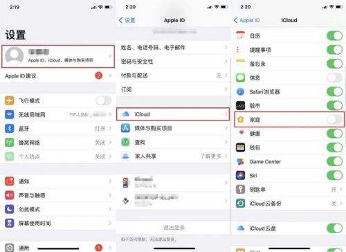 1.开启“设置”,挑选AppleID个人账户,点击“iCloud”将“家庭”前开关调整为关闭情况。