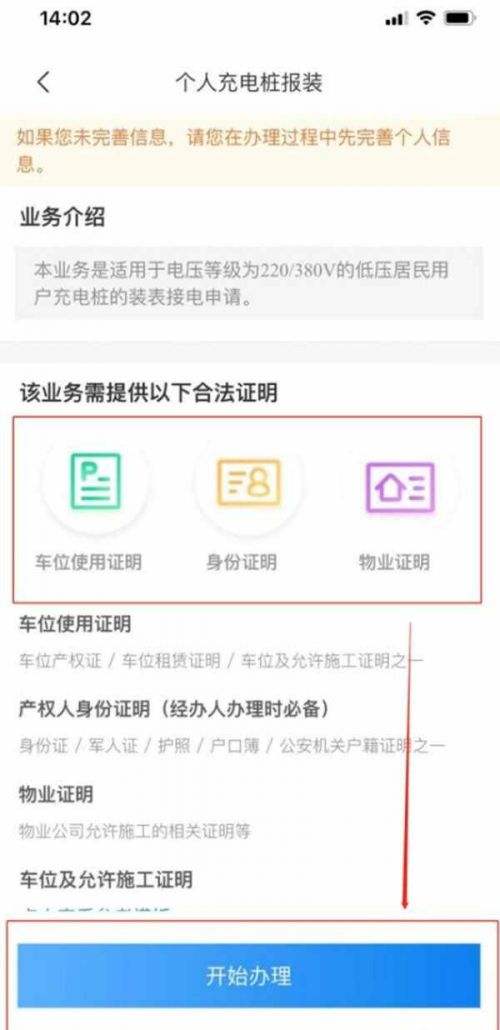 4、办理前需要准备好车位使用证明、身份证明、物业证明,准备好之后点击下方开始办理;