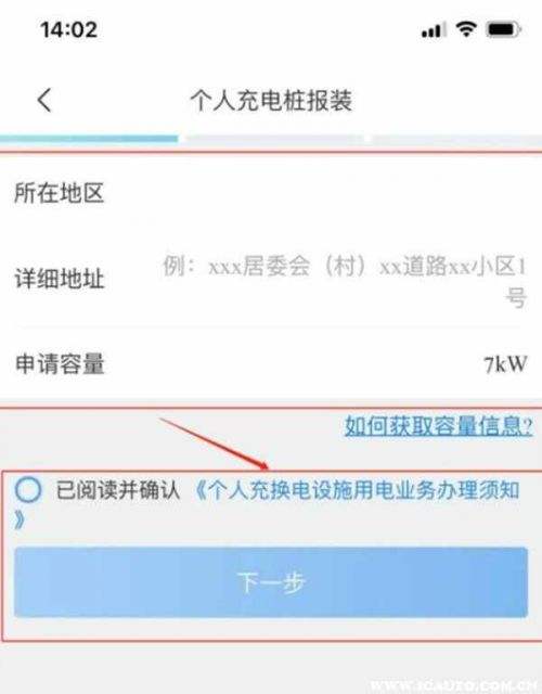 5、在输入所在地区的详细地址后勾选已阅读并确认《个人充换电设施用电业务办理须知》并点击下一步上传准备好的资料证明即可申请成功。
