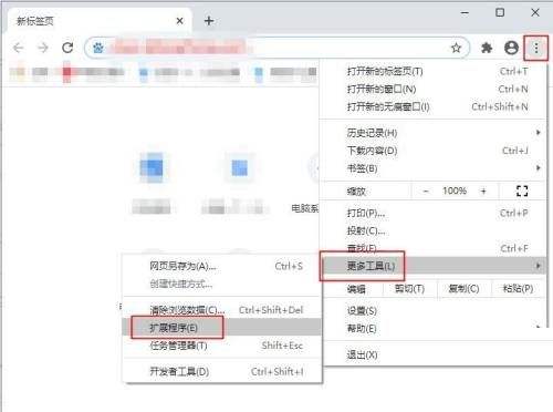 1、首先打开谷歌浏览器,依次点击右上角三点、更多工具、扩展程序。