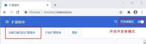 2、然后保证开发者模式开启状态,然后点击“加载已解压的扩展程序”。