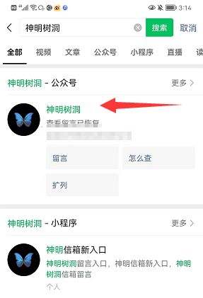 1、进入微信搜索神明树洞,找到下图第一个搜索结果点击进入。
