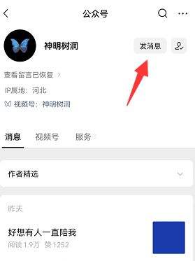 2、来到神明树洞账号页面,点击右上角的关注然后选择发消息。