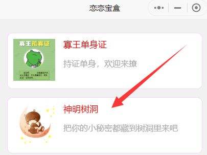 1、微信搜索恋恋宝盒小程序,点击进入找到神明树洞(如下图)。