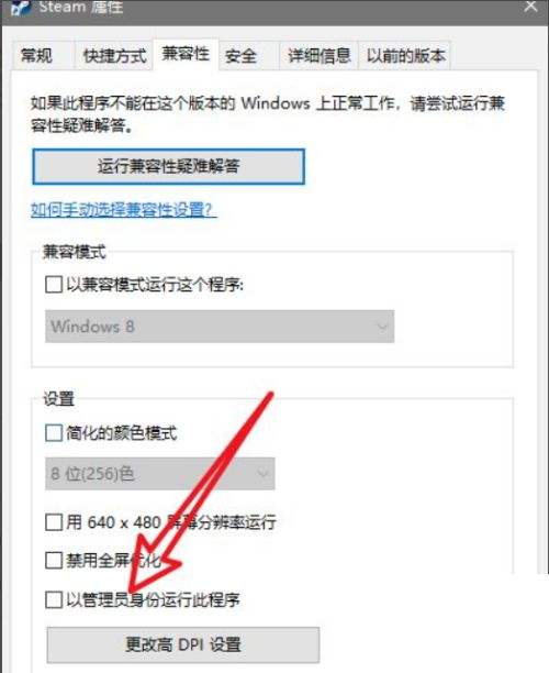 6.最后切换到兼容性标签,检查管理员权限运行后,重新运行steam即可。如下图所示: