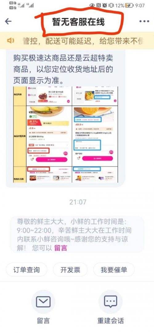 小编想咨询在线客服关于每日优鲜剩余存储价值的问题,但发现客服页面显示没有客服在线,只支持留言。但正常情况下,目前仍处于客服时间,客服对话页面也显示客服时间为9:00-22:00。