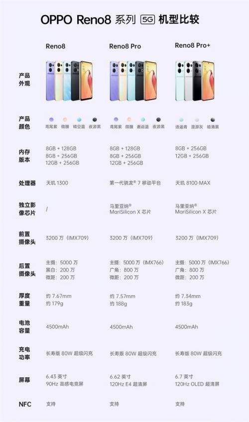 opporeno8搭载联发科天际1300处理器,拥有8个核心,主频最高3个.0Ghz,闪存为UFS3.1,内存为LPDDR4x,拥有8GB+128GB/8GB+256GB/12GB+256GB不支持存储卡的三种规格。