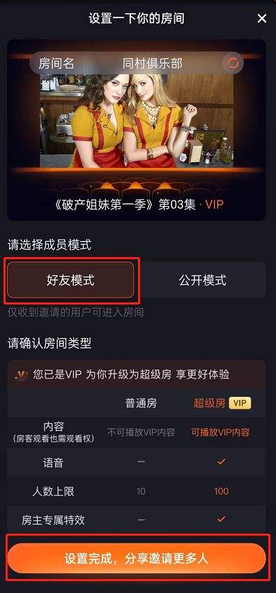 2.VIP用户将直接升级到超级房间,选择成员模式,然后单击“设置完成,分享邀请更多的人”。