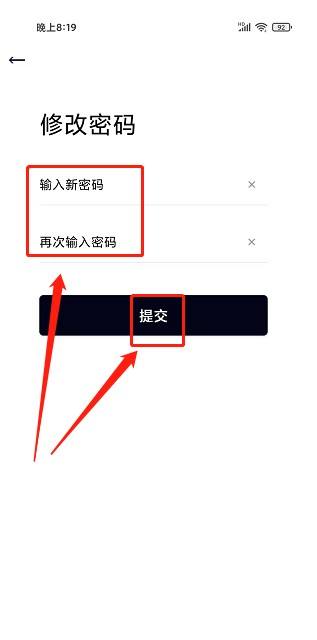 进入修改密码界面,输入新密码,确认新密码,点击提交。