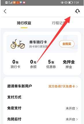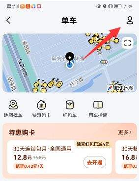2、进入骑车页面以后,点击右上角的【个人中心】。