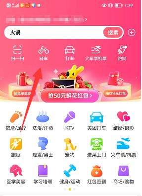 1、首先我们需要登录美团app,在应用首页点击上方的【骑车】按钮。