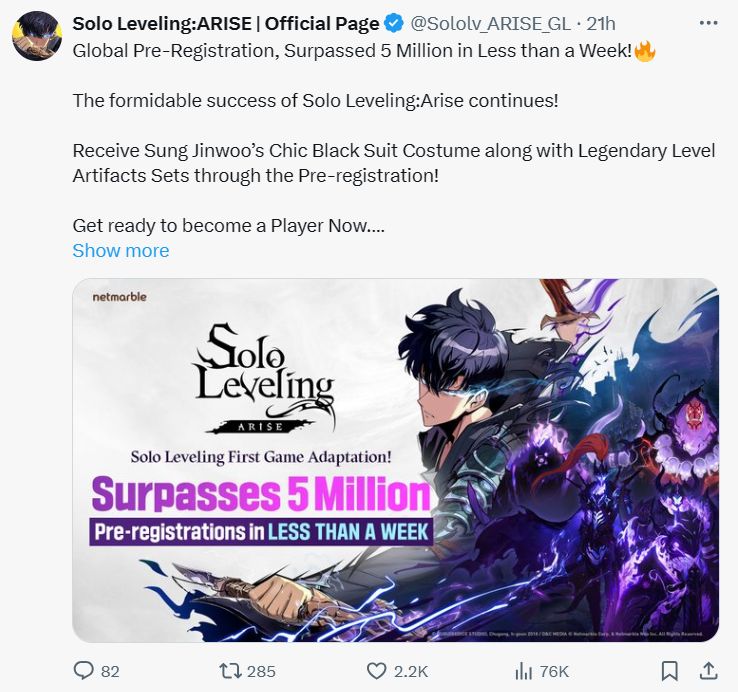 近日,官方发文宣布《我独自升级:崛起》全球预注册人数不到一周就已突破500万,该作的巨大成功仍在继续。