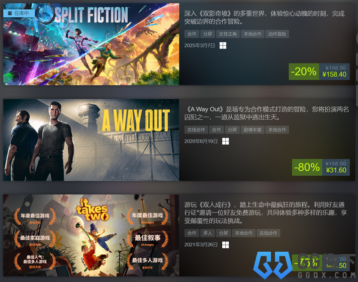 大促期间,另外两款来自 Hazelight 工作室的优秀合作游戏也将参与促销! 即刻购买《逃出生天》立享二折优惠,你将扮演一名囚犯,与另一名囚犯一起逃出监狱。一开始紧张刺激的越狱计划,却转瞬间发生出人意料的转折,带来一段前所未见、情感交织而难以捉摸的冒险。 即刻购买《双人成行》立享二五折优惠,踏上专为二人合作游玩打造的疯狂之旅。你们将扮演科迪和小梅携手闯关,在每个新关卡中掌握独特且彼此关联的角色技能。